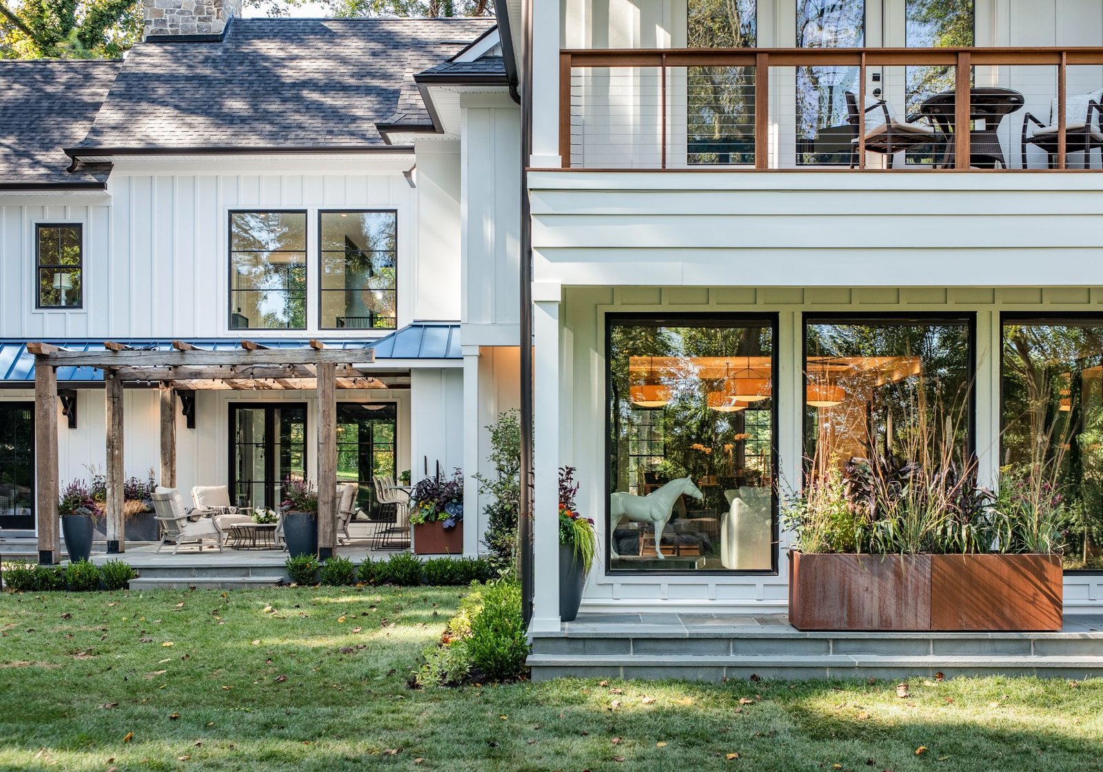 • best custom homes wayne pa - design home studios - home exterior - patio area - large windows - grey exterior - aerial shot